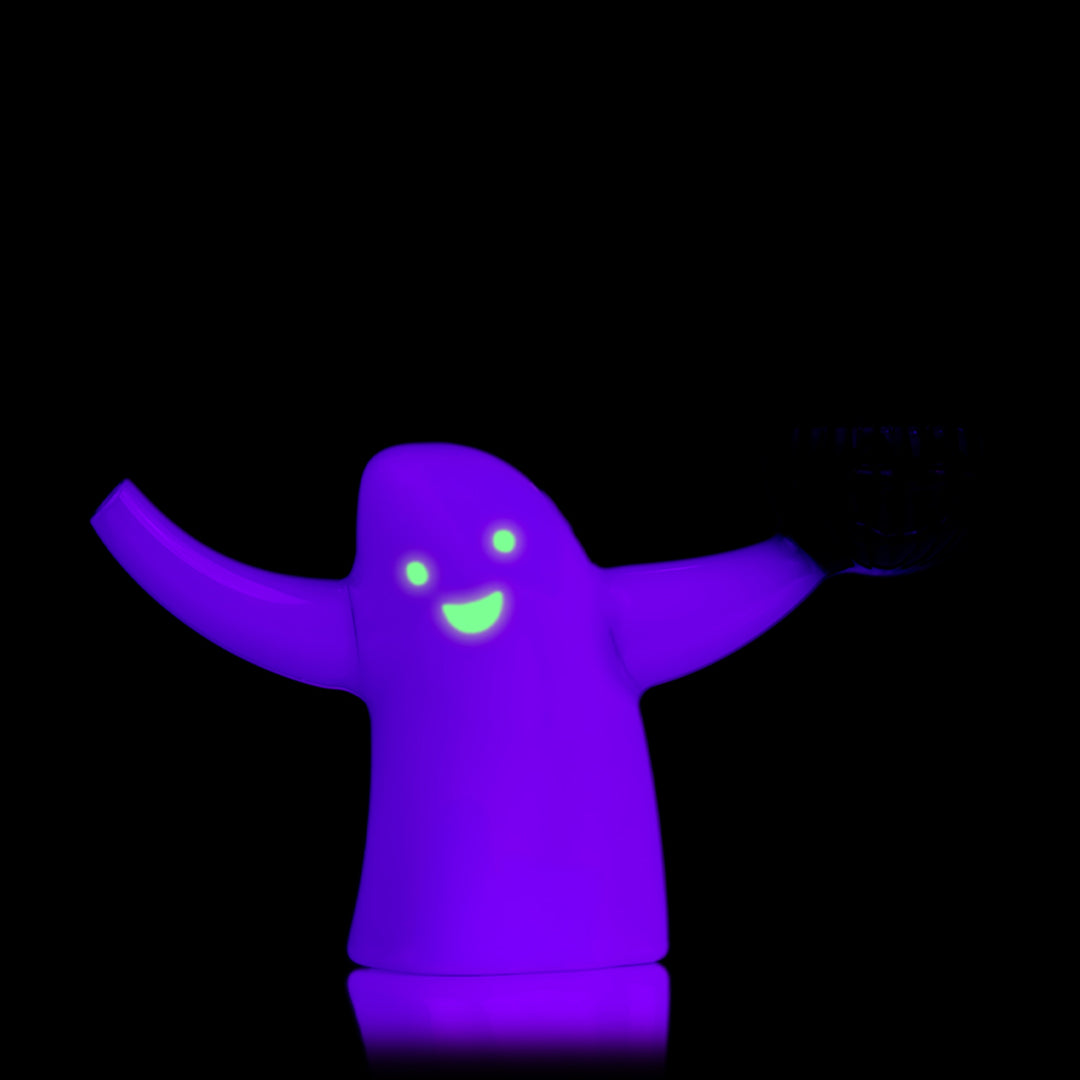 Celebrate spooky season with MJ Arsenal’s 8th Annual Limited Edition Ecto Bubbler, a pocket-friendly piece made from 100% borosilicate glass. Featuring a glow-in-the-dark ghost face, vibrant full-color Ghost & Pumpkin design, and an ergonomically placed carb hole, this handmade bubbler is as festive as it is functional.